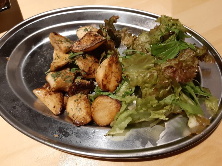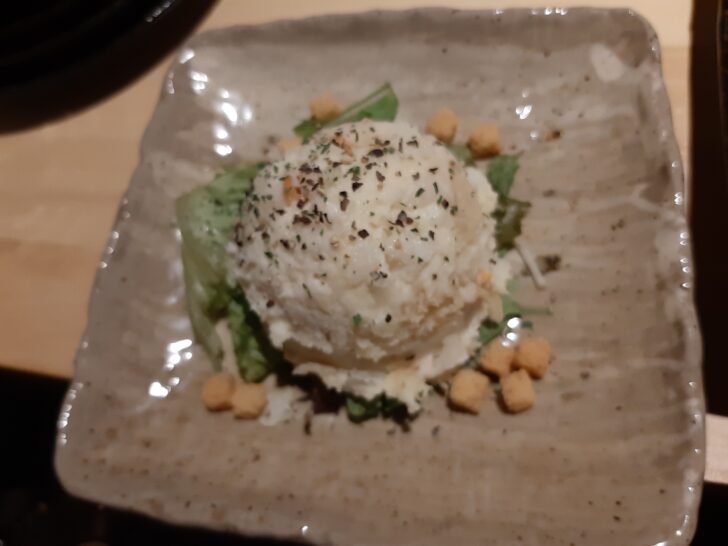 ➂最初に先出し4品(サラダ・唐揚げ・餃子・えびせん)が出ます。