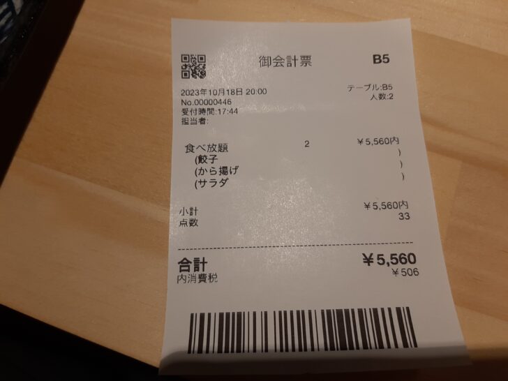 スマホで会計すると、席まで伝票を持ってきてくれました。これを持ってレジで支払いをします。【\2780/人】でした。もの凄く安いですね。