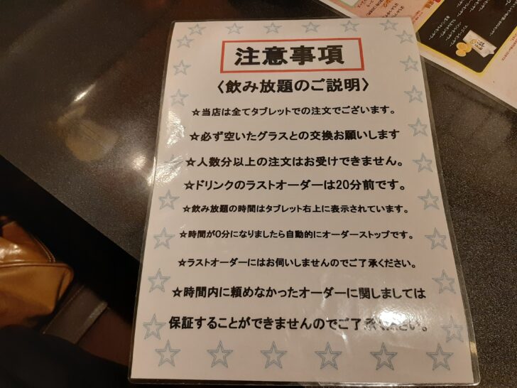 今回は【唐揚げ&油淋鶏&手羽先揚げ食べ放題&選べるメイン】全8品地酒5種150分飲放【税込3,000円】を予約しました。月~木は150分飲放で、金・土・日・祝・祝前日は120分飲放となります。席には、飲み放題の「注意事項」を記載したものが置いてあるので、確認しておきたいですね。
