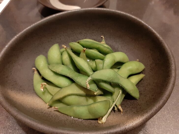 一品目は塩ゆで枝豆です。2人分としては、少ないですね。