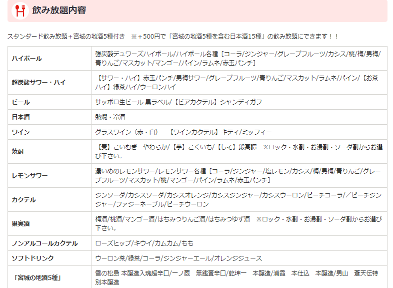 飲み放題内容は、生ビール・ハイボール・サワー・焼酎・ワイン等がありますが、嬉しいのは、宮城の地酒5種が飲めることですね。