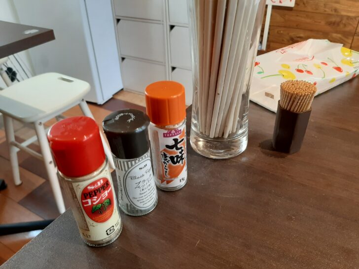 卓上調味料は白胡椒、黒胡椒、七味唐辛子のみですね。