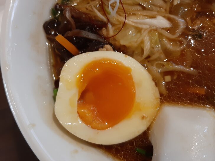 『味噌らーめん(赤)』は、注文後、10分もしないで着丼しました。味噌らーめんとしては、具材もちょっと変わっていました。チャーシュー2枚、煮玉子半個、海苔1枚、きくらげ、ひき肉、にら、キャベツ、玉ねぎ、ねぎ、人参と具沢山ですね。