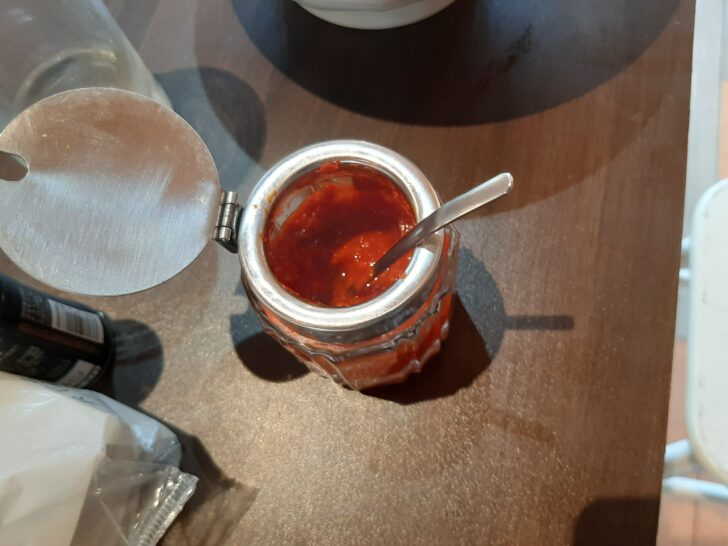 食べ終わってから気付いたのですが、隣のテーブルには、唐辛子ソースみたいな物がおいてありました。