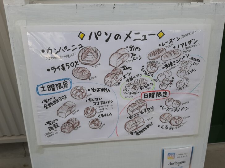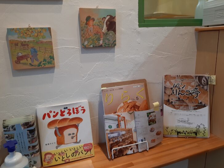 パン『りんご亭』は、ほっこりする?絵が人気のイラストレーター栗城みちのさんが、2021年1月にオープンした食事パンの専門店です。大谷翔平さんと同じように「イラストレーター」と「パン屋店主」との二刀流に挑んでいるようです。パンメニューやお店のイラストもご自身で描かれているようです。お店の営業は、週末の2日間のみで、小さめの陳列棚には、定番メニューや「曜日限定パン」、「季節限定品」などが並んでいます。どのパンも砂糖や乳製品、油脂を入れず、麦の風味をシンプルに引き出しています。酵母は、自家培養酵母を使っていて、粉は国産小麦をメインに全粒粉やライ麦、そば粉なども加わります。人気のカンパーニュは酸味を抑え、火の入れ方等も加減しており、食べ易く、密度が高く、どっしりむっちりとかみしめるほどに深い味わいと香りが広がるパンになっている。