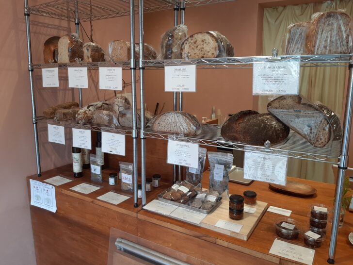 お店のカウンターに並べられた棚にパンがたくさん並べてありました。ほとんどがハード系の食事パンのようですが、どれも美味しそうですね。カウンターには、オリーブオイル、ハーブミックス・スパイスミックスの調味料やクッキー等が並んでいました。