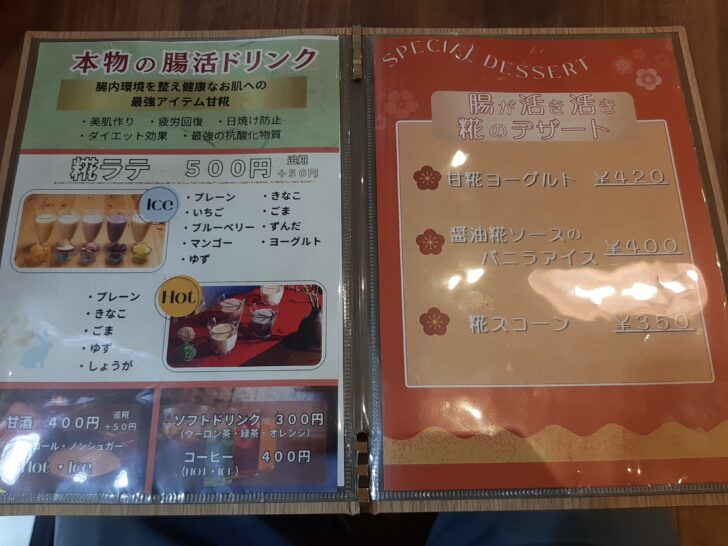 ドリンク・デザート系のメニューは、腸活ドリンクは各種糀ラテ、ヨーグルト、アイス、スコーンなどがありますね。