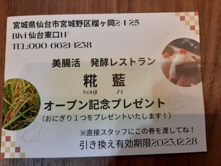今回、オープン日の12月10日に美腸活 発酵レストラン『糀藍(Kouji Ai)』に行きました。オープン記念プレゼントでおにぎり1個がプレゼントされました。これも嬉しかったです。皆様も体(腸)に良い食事を一度食べてみて下さいね。