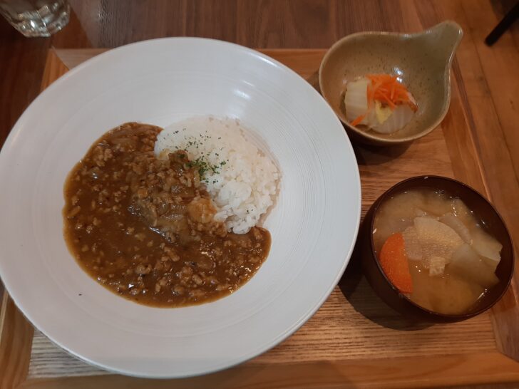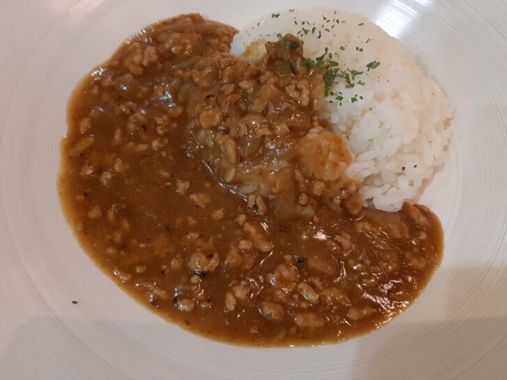 タマネギやひき肉が入ったカレーは、あっさりとしていて美味しいですね。あまり辛くはなくて甘口のような感じですね。