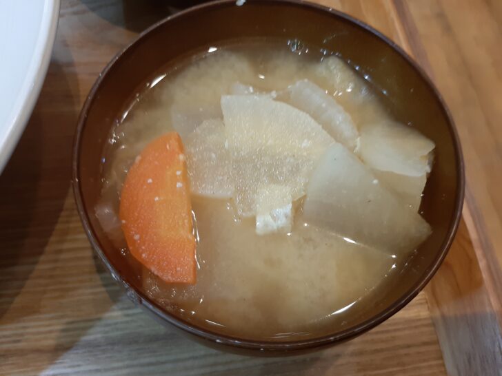 味噌汁は糀味噌を使用しているのだと思われますが、薄味で体に優しくて、健康にに良いと思われて、美味しかったですね。具材は、大根、人参、揚げが入っていました。