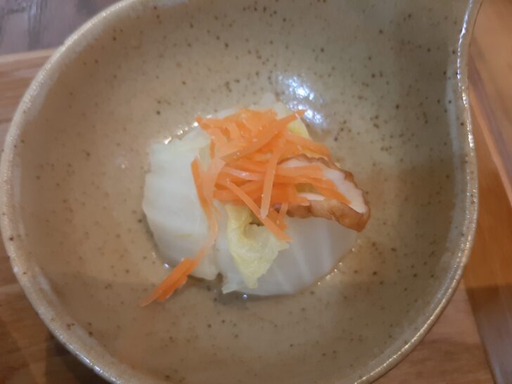 こちらは、小鉢ですが、白菜と人参と竹輪の煮浸しのような感じの料理でした。塩糀の味なんですかね。薄味でした。