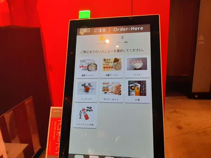商品は券売機兼セルフレジで注文します。ランチタイムは券売機として運用されています。電子マネー等はまだ使用できないようで、当面は現金のみの利用となるようです。