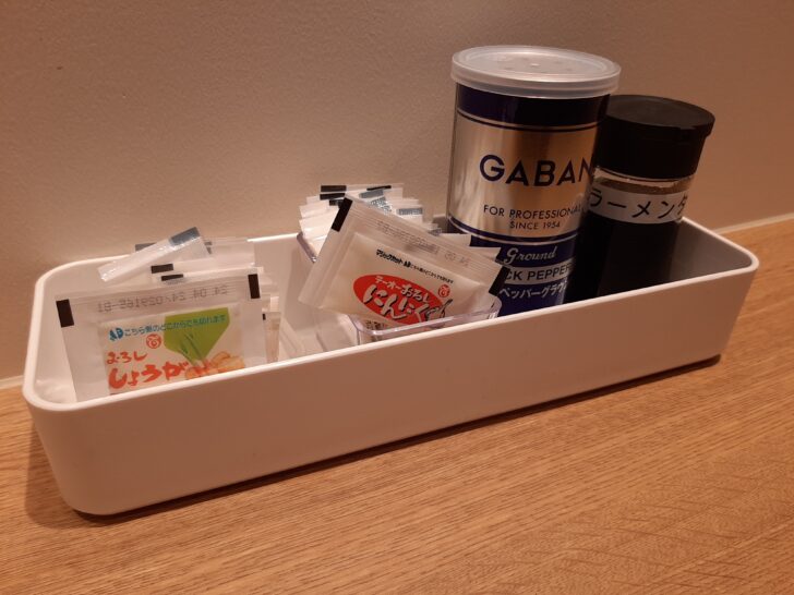 卓上調味料は、おろししょうが、おろしにんにく、ブラックペッパー、ラーメンタレですね。今回注文したあっさり「鶏塩清湯らーめん」に使用するのはブラックペッパーのみになります。お店の方に確認したら、他の調味料はこってりどろそば魚介や特濃醤油に利用するようです。