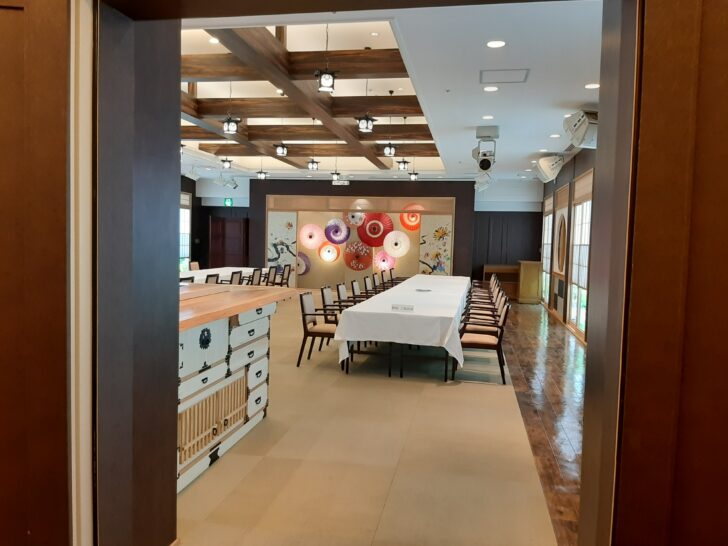 これは2Fにある、親戚・招待客用の男性用更衣室です。中はこんな感じになっていて、結構広かったですね。大きな鏡があって10人程度の人が一度に着替えができるようになっています。