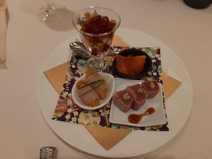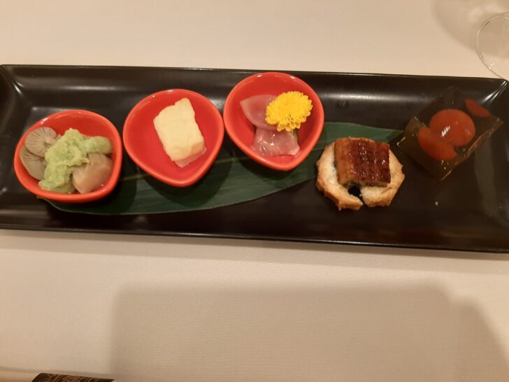 最初は、前菜5点盛。左から、「茸と里芋のずんだ掛け」「揚げだし?」「生ハムきゅうりサラダ」「鰻のブルスケッタ」「さくらんぼ入りゼリー」