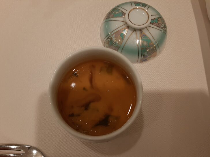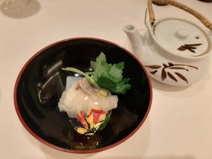 2番目は【吸物】です。内容は「鯛氷室花びらコラーゲン清汁仕立て」。