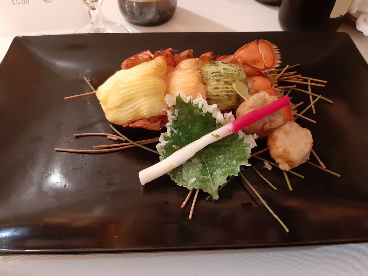 4番目は【焼き物】で「オマールエビ三色素焼 揚げ蕎麦敷き」