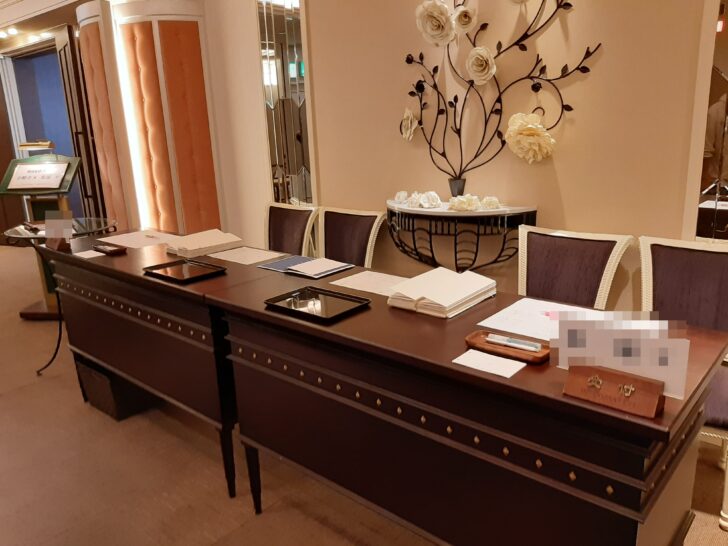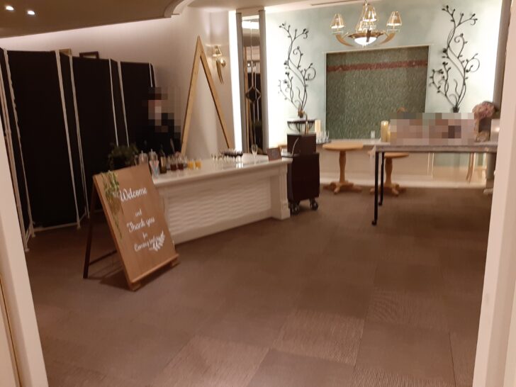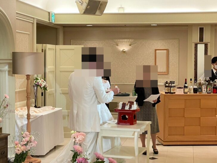 披露宴会場の入口では、スタッフがウェルカムドリンクをサービスしてくれました。ビール、ワイン等のアルコール類とウーロン茶、オレンジジュース等のソフトドリンクが準備されていました。