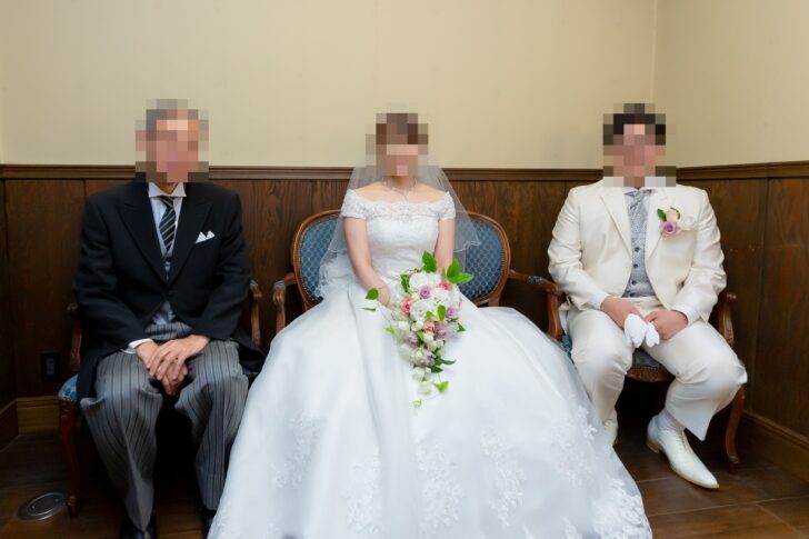 『パレスへいあん』の結婚式は、和式と洋式の式場が分かれていて、和式は最上階の神殿にて行います。洋式は1階のチャペルで行いますね。新郎・新婦の控室に、新婦の父が招かれて写真撮影しました。