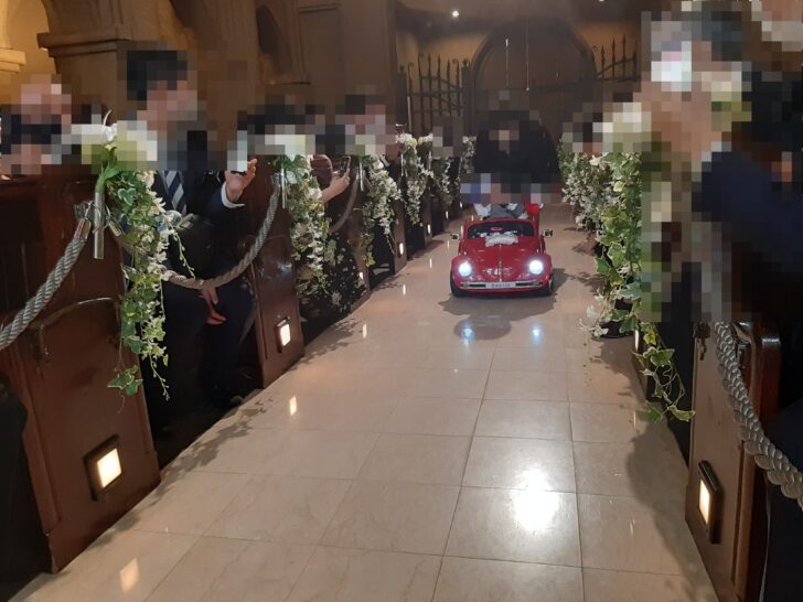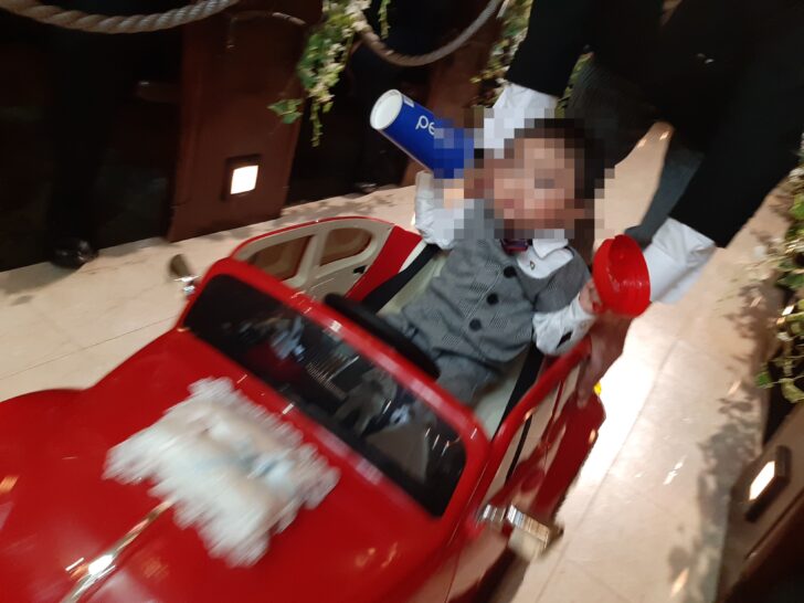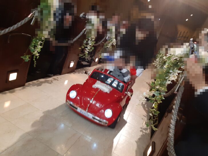 サプライズ演出です。1歳の息子が赤い車に乗って登場しました。サポートは新郎の父でした。