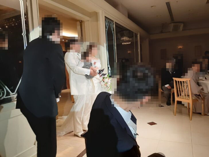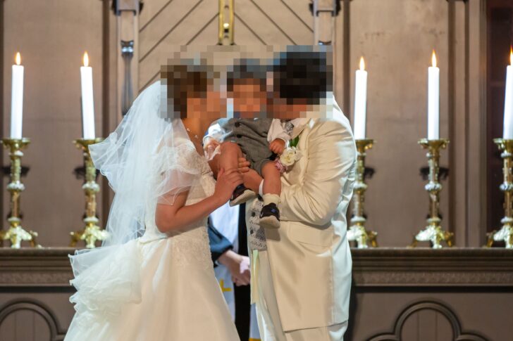 新郎・新婦に息子が手渡されました。嫌がる息子にキッス。