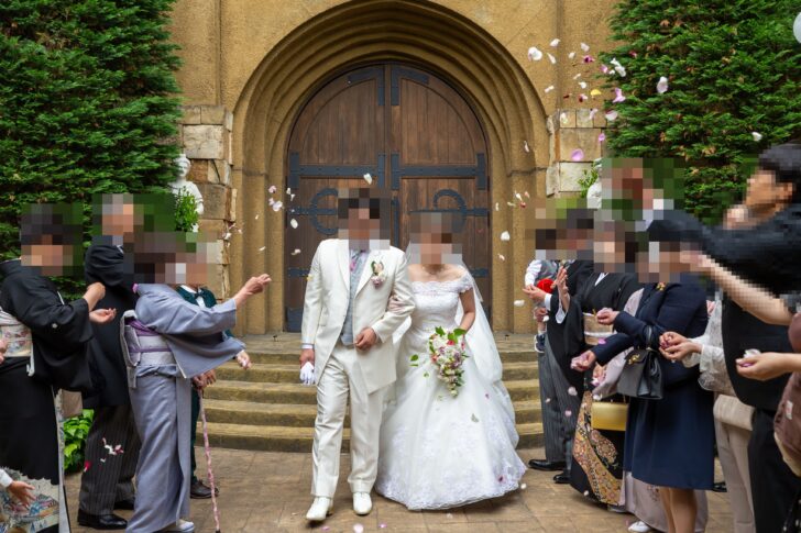 新郎新婦がチャペルから出てくると、親族・招待客の紙吹雪で祝福されました。