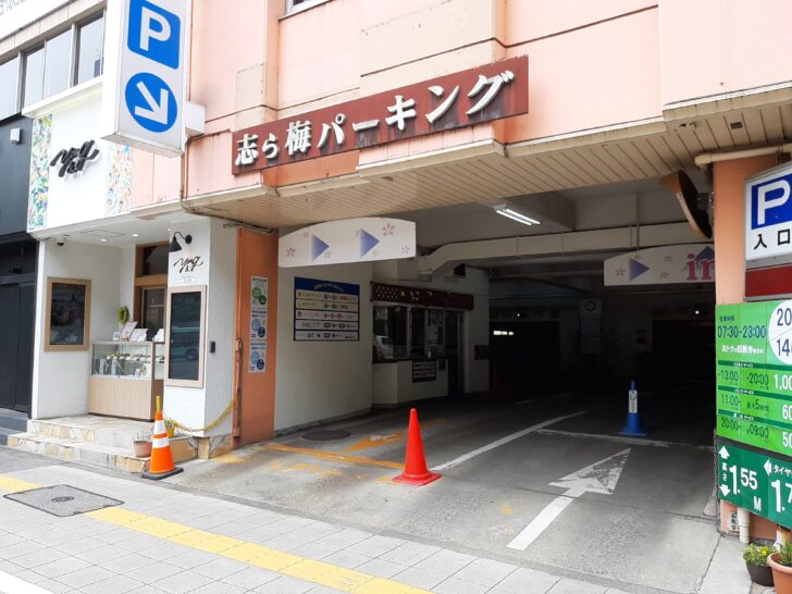 一番近いのは、正面玄関のすぐ左隣にある『志ら梅パーキング』ですが、車のサイズ制限があるので、注意が必要ですね。RV車、大型車、ミニバン、軽ワゴン等は入庫不可ですね。