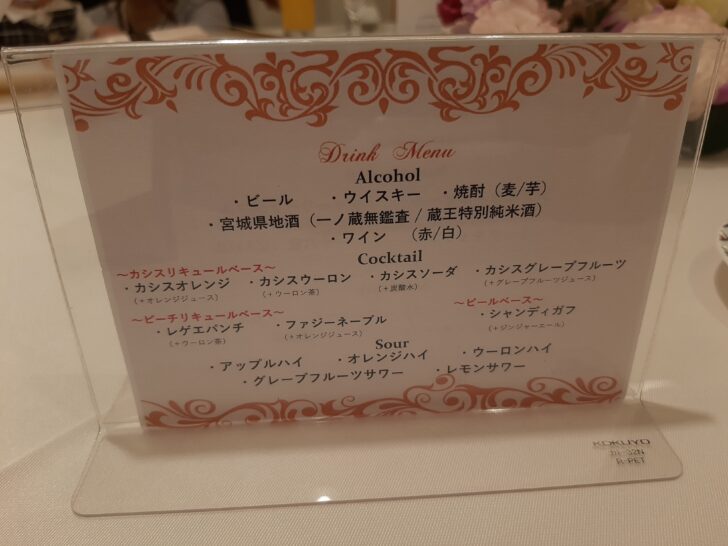 今回の披露宴のメニューを紹介したいと思います。ドリンクは、飲み放題になっていました。アルコール系は、ビール、ウィスキー、焼酎(麦/芋)、宮城県地酒、ワイン、カシス飲料、サワー各種がありました。