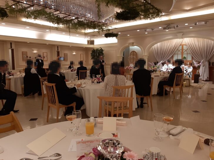 これが披露宴会場です。3年越しのウェディングは、当初予定より減って、60名程度になりました。