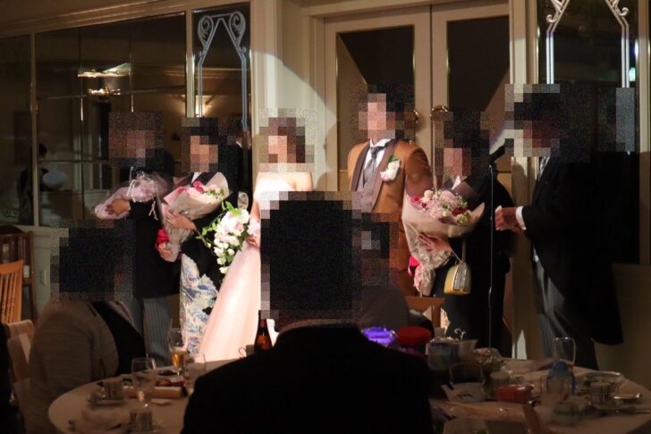 披露宴の最後に新郎新婦より両親へ花束&記念品(息子の体重分のお米)が贈呈されました。