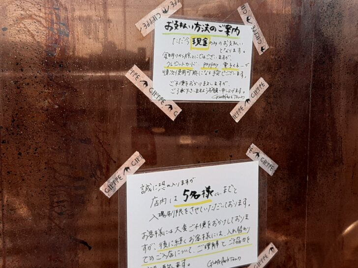 また、支払いは現金がメインとなっていますので、現金持参が必須ですね。いつからか良くわかりませんが、順次、クレカ、PayPay、電子マネー等が使用可能となるようです。また、狭めのお店なので、一度に入店できる人数は5名程度に入場制限されています。入店の案内は、お店のスタッフの方が案内してくれますが、入店までには、少し時間が掛かりますね。