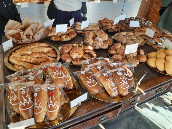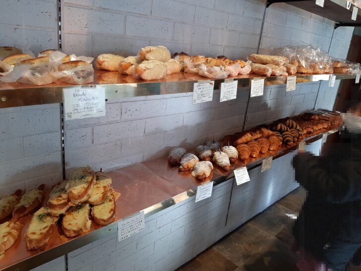 これは店内の様子ですが、メインテーブルと店奥にある陳列棚にパンが並んでいましたね。パンの種類は30種類程度でしたね。