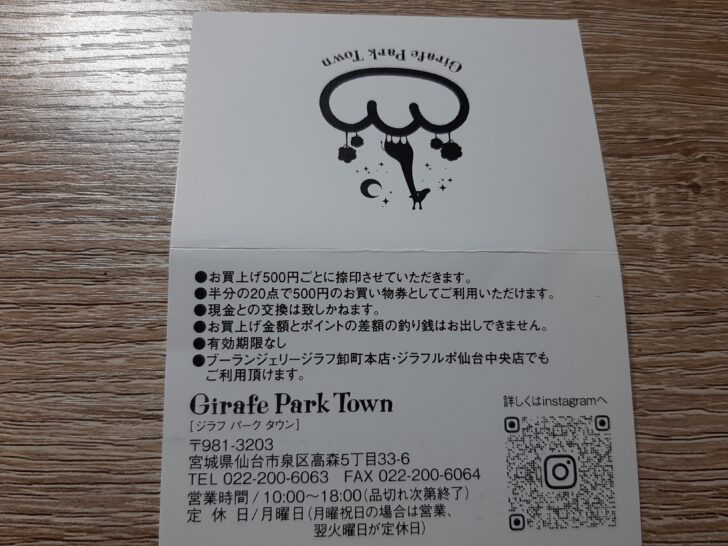 『ジラフパークタウン』では、他のジラフのお店と同じように、ポイントカードが貰えます。500円購入毎に1ポイント貰えて、20ポイントで500円のお買物券と利用できます。他のお店(ジラフ卸町本店、ジラフルポ仙台中央店)でも利用可能のようです。