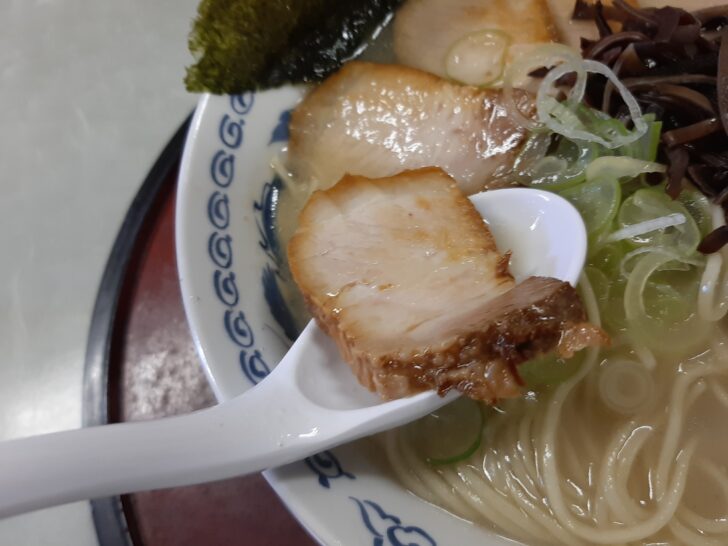 一番のおすすめは、「塩鶏清湯らぁー麺」のようですが、今回は、「塩豚骨チャーシューらぁー麺」を注文しました。具材は、豚バラチャーシューが6枚、きくらげ、ねぎ、海苔1枚です。