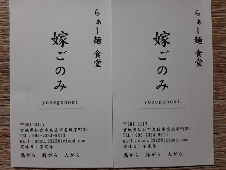『らぁー麺食堂 嫁ごのみ』は、若いイケメンの店主さんと美人の奥様が切盛りしているお店ですね。店主さんと奥様の笑顔と爽やかな挨拶がとても気持ち良くで、また来たいと思わせるお店でした。またお店の奥からは赤ちゃんの泣き声がしていたので、大丈夫かと心配になりましたが、おばあちゃん?があやしていたようなので安心しました。私も孫が生まれた所なので、凄く気になります。帰りには美味しかったです、また来ますと思わず声掛けしてしまいました。次回は「塩鶏清湯らぁー麺」を食べに行きますね。最後にお店の名刺をいただいてきましたが、さりげなく『鳥がら、豚がら、人がら』の記載がありました。人がらは◎ですね。