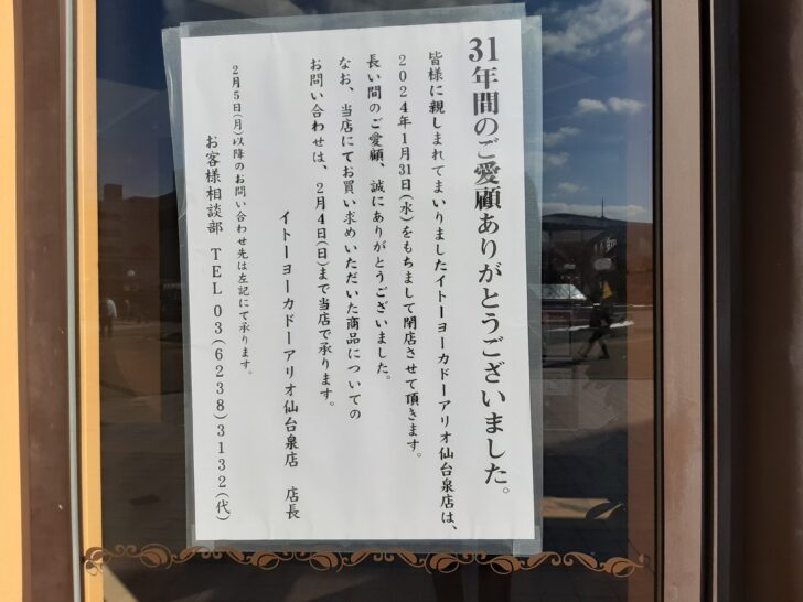 『アリオ仙台泉店』は残念ですが、2024年1月31日(水)で、31年間の営業が終了します。泉区に持ち家して住んでから、約30年経過しましたが、数えくれないくらい行ったので非常に寂しいです。
