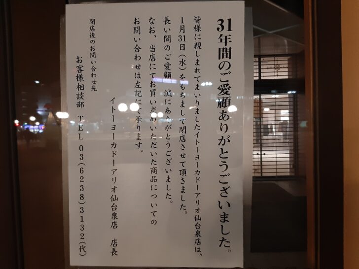 非常に残念ですが、仙台市泉区泉中央駅のショッピングモール『アリオ仙台泉』が2024年1月31日(水) 20:00をもって閉店しました。『イトーヨーカドー仙台泉店』時代から合わせて31年間の歴史に幕を閉じました。私が泉区に住んでから約30年経過しましたが『イトーヨーカドー仙台泉店』の時から含めて、数え切れないくらいの回数通いました。『アリオ仙台泉』と共に生きて来たと言っても過言ではありません。ここ数年は会社帰りに毎日のように立ち寄り、食料品やお酒などを購入していました。また、休日には家族でショッピングに行っていました。今回閉店セレモニーと閉店後の様子を見てきたので紹介します。