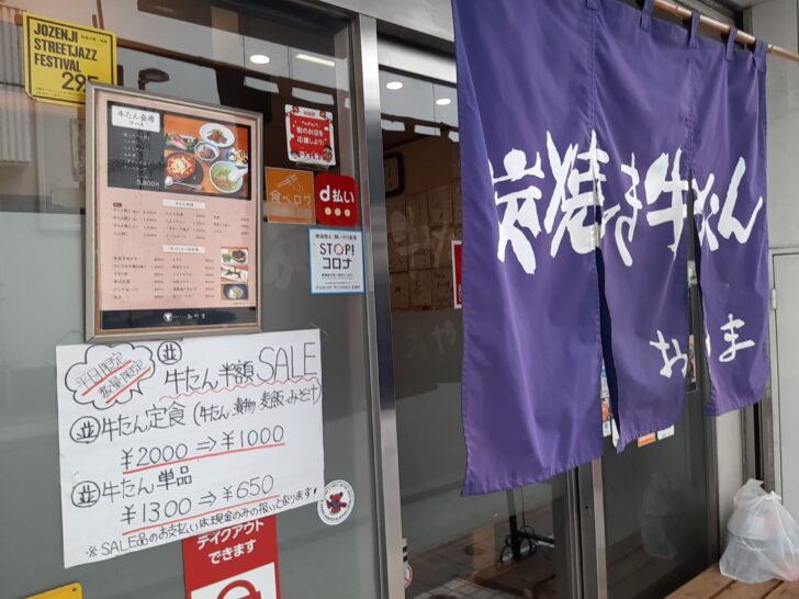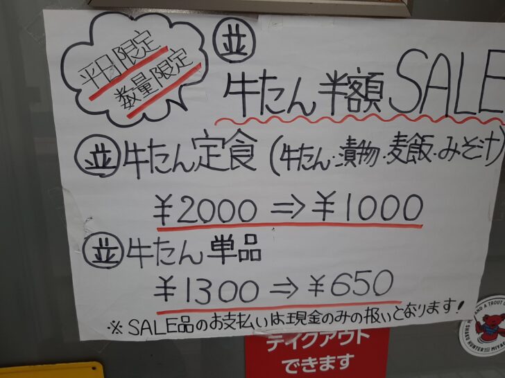 仙台市青葉区一番町の仙台フォーラス裏にある『牛たん おやま』では、期間は分かりませんが、平日限定(数量限定)ではありますが、「牛たん定食」、「牛たん焼き」を半額で提供するセールを行っているようなので紹介します。