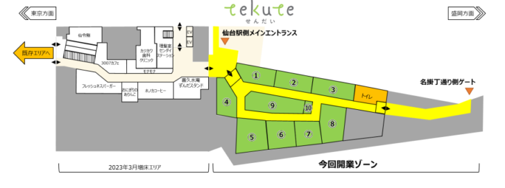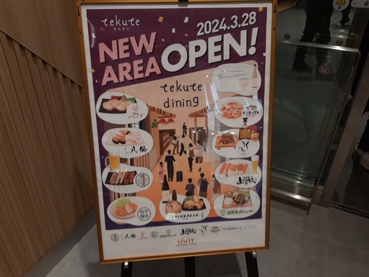 仙台駅西口1階北側に『tekute dining』という名称の10店舗の飲食店が集まる飲食店ゾーンが2024年3月28日(木) 11時にオープンしました。オープンして最初の休日である3/30(土)のランチタイムに早速行ってみたら、大混雑していて行列もできていました。その時の『tekute dining』の様子を紹介します。