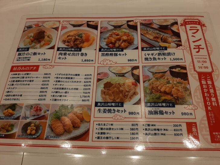ランチタイムは具沢山味噌汁とのセットになっているセットメニューになっていますね。(生姜焼き、油淋鶏、焼魚、酢豚)などがありました。