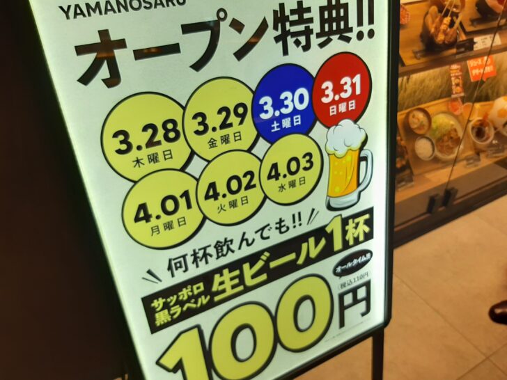 オープン記念特典として、3/28~4/3迄、【何杯飲んでも】生ビール1杯100円で提供されるようでした。