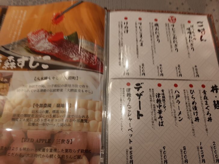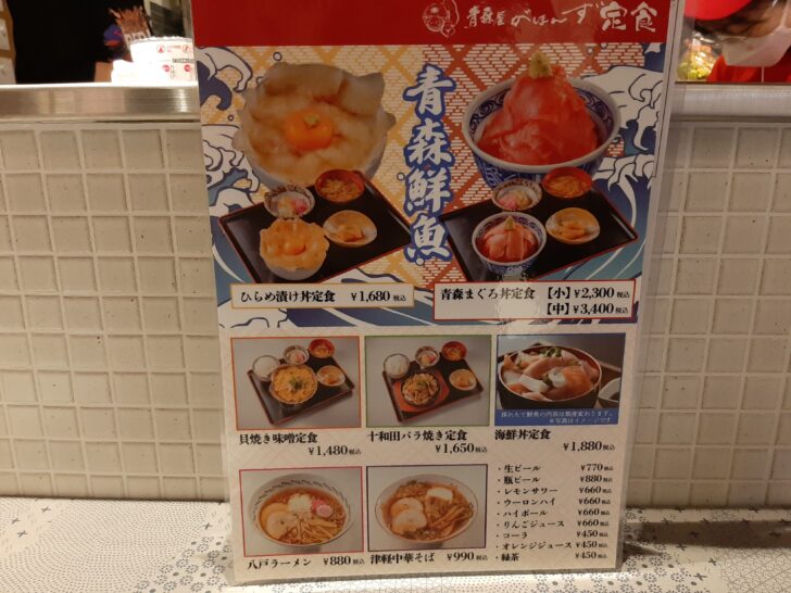 ランチメニューは、イチオシの「ひらめ漬け丼定食」【税込1680円】、「青森まぐろ丼定食」【税込小:2,300円、中:3,400円】、「貝焼味噌定食」【税込1,480円】、「十和田バラ焼き定食」【税込1650円】、「海鮮丼定食」【税込1,880円】、「八戸ラーメン」【税込880円】、「津軽中華そば」【税込990円】