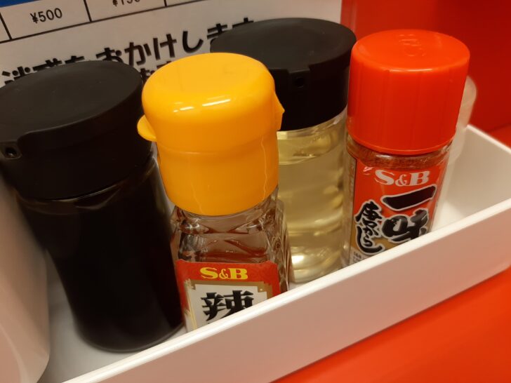 卓上調味料は、醤油、辣油、酢、一味唐辛子、胡椒がありました。