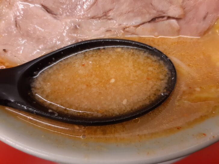 スープは、背脂が入ったまろやかでコクがあり、味噌の美味しさが感じられる美味しいスープです。辛野菜ですが、そんなに辛過ぎず良い塩梅ですね。