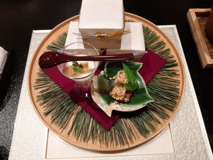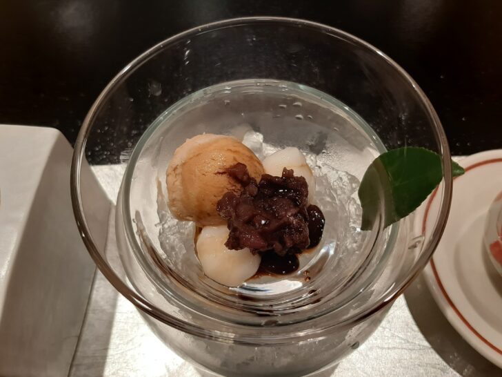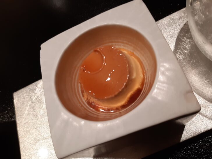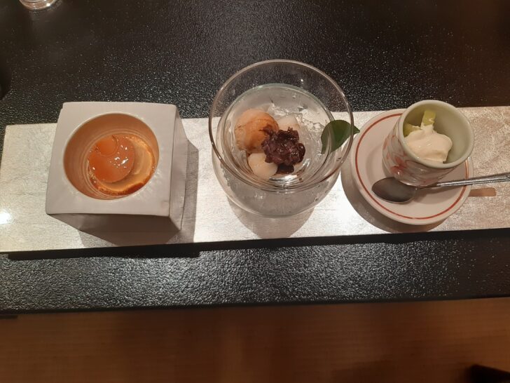 9品目は自家製デザートです。 これも豪華ですね。3種類もでてきます。左から定番プリン、ほうじ茶アイス白玉あんみつ、ロマノフと季節のフルーツです。最後の締めも間違いない美味しさでした。