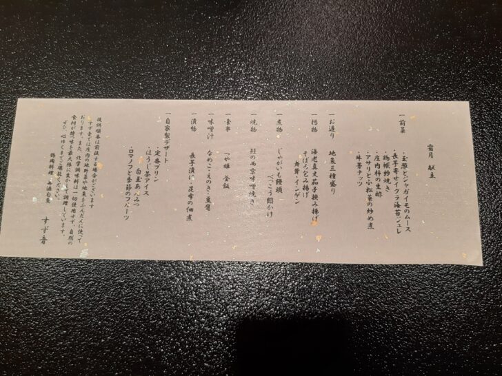 今回注文した「懐石コース」のお品書きはこちらの9品ですね。今回もどの料理も手が込んでいて、美味しくてビジュアルも最高ですね。初めて参加した人にも、大好評でした。