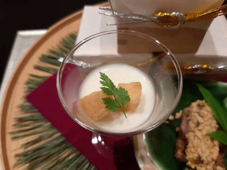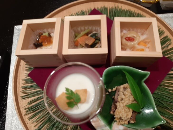 これは、後方左から長芋寄せイクラ海苔ジュレ、アサリと小松菜の炒め煮、庄内柿の生酢