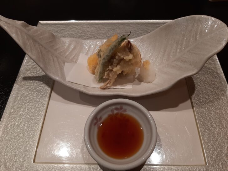 3品目は揚げ物:天ぷらです。海老真丈茄子挟み揚げ、そぼろ包み揚げ、舞茸、インゲン