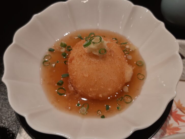 4品目はじゃがいも饅頭べっこう餡かけです。
