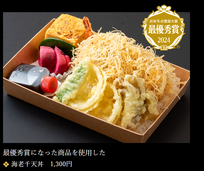 尚、実際は次のように受賞作品をアレンジした「おにぎり弁当 1,500円」、「海老千天丼 1,300円」として販売しているようです。